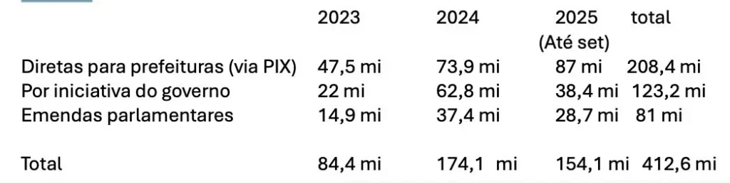 São três modalidades de gastos dessa natureza. Pela via direta do Estado para as prefeituras (via PIX), de 2023 a setembro deste ano, foram R$ 208,4 milhões, distribuídos da seguinte forma: em 2023, um total de R$ 47,5 milhões; em 2024 saltou para R$ 73,9 milhões; e, até setembro de 2025, R$ 87 milhões. Portanto, antes do fechamento do ano, esses gastos já superaram 2023 e 2024.