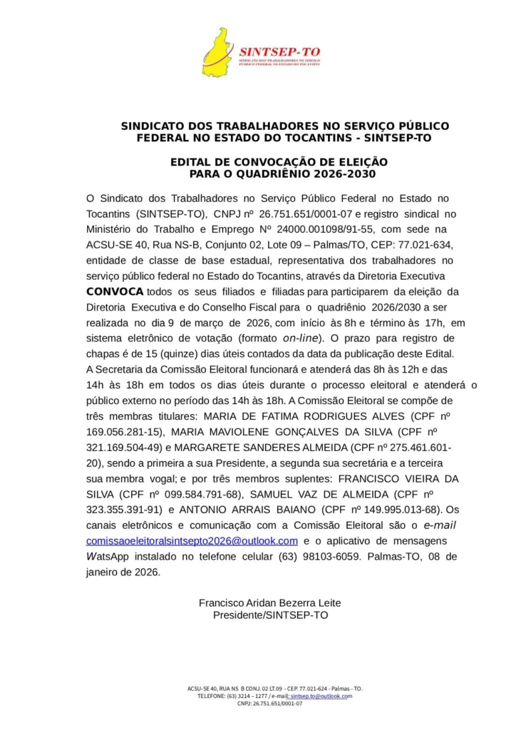 SINTSEP-TO | Edital de convocação de eleição para o quadriênio 2026-2030