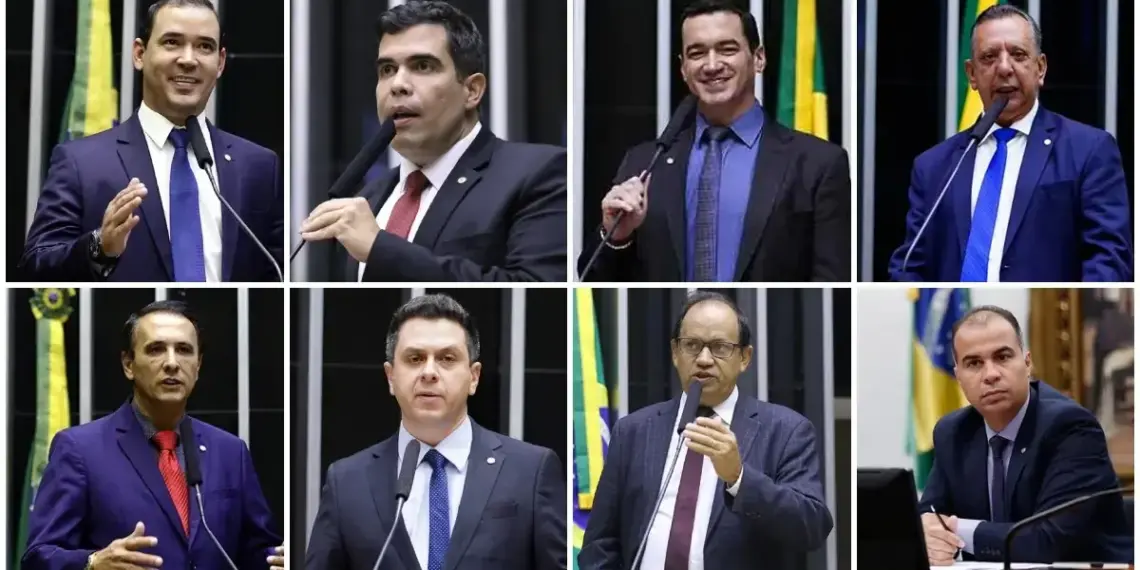 Deputados da bancada federal tocantinense: Vicentinho Júnior, Carlos Gaguim, Ricardo Ayres, Tiago Dimas, Alexandre Guimarães, Eli Borges, Filipe Martins e Antônio Andrade (Fotos: Câmara | Montagem: CCT)