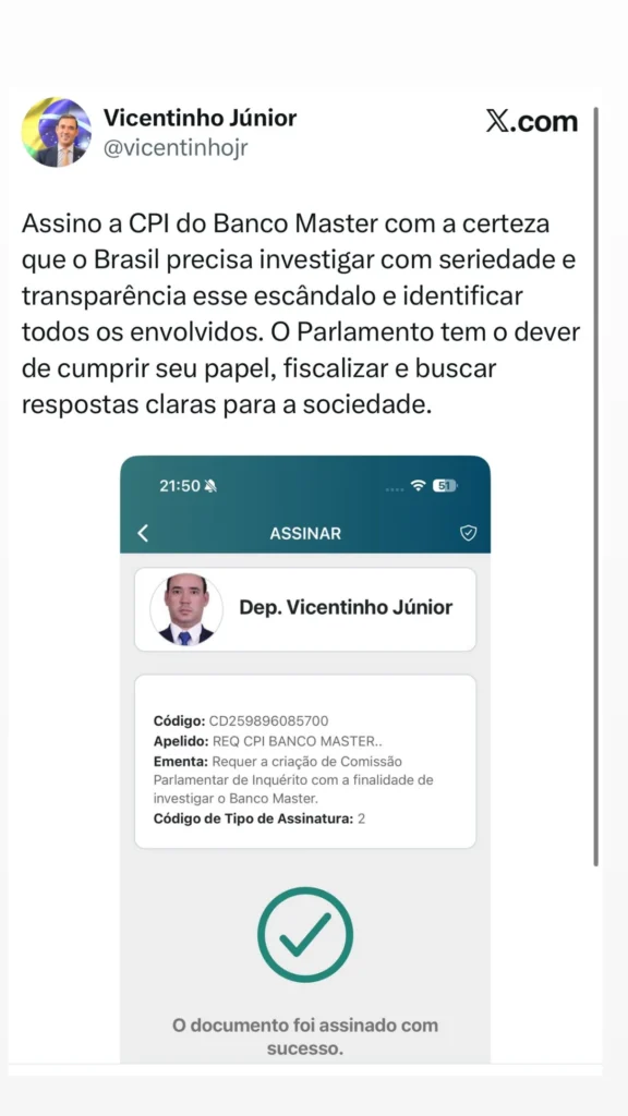 O deputado federal Vicentinho Júnior (Progressistas) anunciou na noite desta domingo, 28, ter assinado o pedido de instalação de Comissão Parlamentar de Inquérito (CPI) para investigar o Banco Master, alvo da Polícia Federal (PF) pela concessão de créditos falsos e por uma negociação de compra pelo Banco de Brasília (BRB), instituição pública ligado ao governo do Distrito Federal e que inclusive opera a folha de pagamento do funcionalismo tocantinense. De acordo com as investigações, as fraudes podem chegar a R$ 17 bilhões. “Assino com a certeza que o Brasil precisa investigar com seriedade e transparência esse escândalo e identificar todos os envolvidos. O Parlamento tem o dever de cumprir seu papel, fiscalizar e buscar respostas claras para a sociedade”, escreveu nas redes o parlamentar.