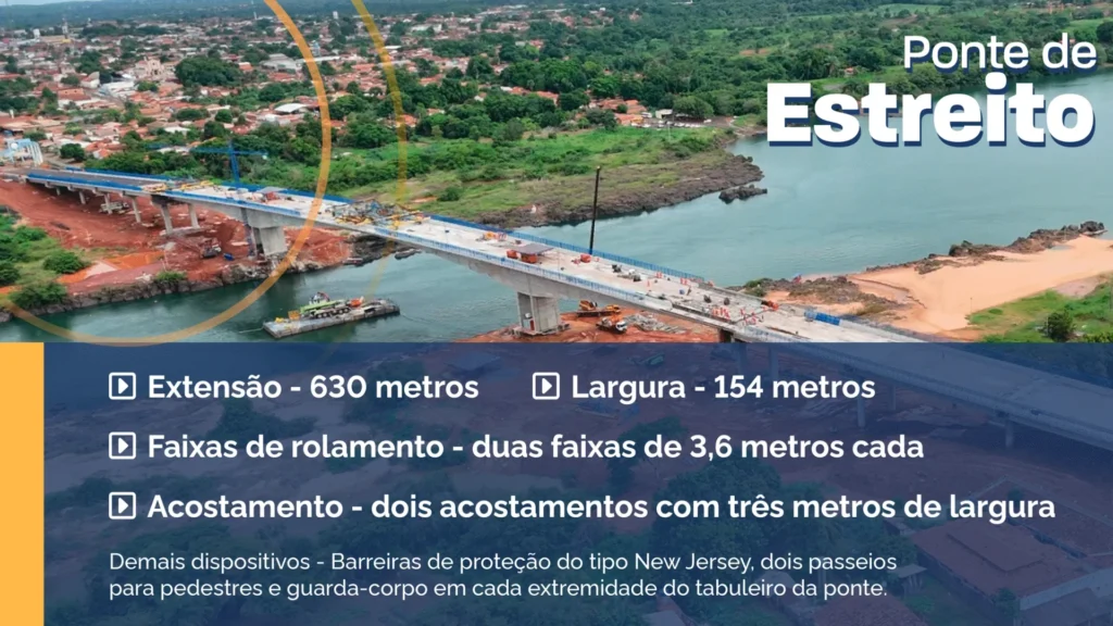 Com cerca de 500 colaboradores atuando em dois turnos, os serviços avançam simultaneamente na execução dos acessos, protensão dos cabos laterais, no asfaltamento da ponte e na implantação das barreiras e do guarda-corpo. Nos próximos dias, as equipes iniciarão a aplicação das juntas de dilatação do balanço sucessivo e dos encontros nos lados do Tocantins e do Maranhão, além da execução das calçadas nos acessos e da laje de transição no lado tocantinense da ponte. Por fim, serão implantados a sinalização e o sistema de segurança viária.